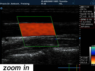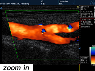 Mit Hilfe des Ultraschalls können unter Anwendung der Doppleruntersuchung und der Farbcodierung des Blutflusses die verschiedenen Gefäße des Körpers untersucht werden: Zum Beispiel die Halsschlagadern (Carotiden), die Bauchschlagader (Aorta abdominalis), die Nierenarterien, die Beingefäße etc. Die Darstellung der Nierengefäße dient der Abklärung eines hohen Blutdrucks. Mit der Untersuchung der hirnversorgenden Gefäße können Verengungen oder Verkalkungen beurteilt werden, sie kann außerdem auch Hinweise auf eine möglicherweise gleichzeitig bestehende Herzerkrankung geben.