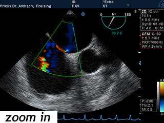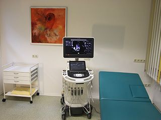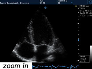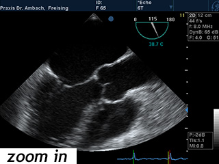 Die Echokardiographie, kurz "Echo", ist eine Ultraschalluntersuchung des Herzens, mit der insbesondere die Funktion des Herzmuskels und die Herzklappen untersucht werden können. Sie ist eine Standarduntersuchung bei fast allen Herzerkrankungen und ist ohne jegliche gesundheits- schädliche Einflüsse. Auch Auswirkungen eines hohen Blutdruckes auf den Herzmuskel lassen sich damit feststellen. Die hochtechnisierten Geräte hierfür nutzen den Dopplereffekt zur Geschwindigkeitsmessung der Blutströmung und stellen die Flussrichtung des Blutes farbcodiert dar.
